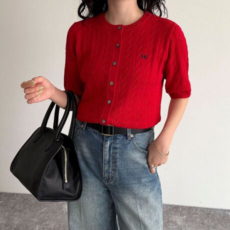 ・カラーバリエーション豊富なFR刺繍ケーブル柄半袖カーディガンです