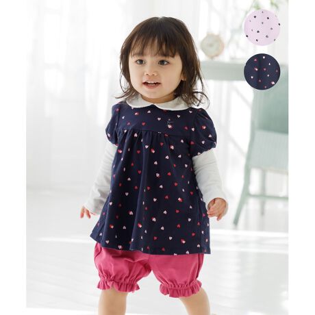 [型番:SRKDGS0102]■デザイン襟付きワンピースに長袖をレイヤードしているようなワンピースです。ボトム付きでセットでご着用いただけます。■ポイント赤ちゃんにも優しいコットン100%仕様で安心してご着用いただけます。プレゼントにも最適なアイテムとなっております。■カラーハート柄が映えるネイビー×ピンクと、可愛らしい印象のラベンダー×ネイビーの2色展開です。※撮影商品はサンプルを使用しているため、実際にお届けする商品と仕様やサイズが異なる場合がございます。