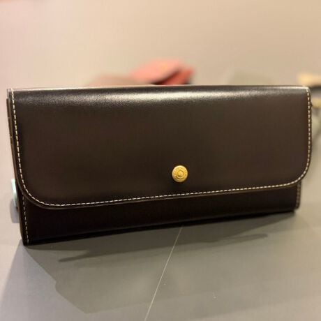 真鍮製のドーム型オリジナルブローチがポイントのクラシックなスタイル。表のヌメ牛革はコシや手触りを損なうことがなく革本来の風合いを最も活かせる丘染め。ヌメ革丘染めならではの経年変化も楽しんでいただけます。クラシカルな重厚な見た目と現代らしい軽やかさの両立を目指し、革厚を極限まで追求。前段にカードポケットx 6 が実装されており、カードを取り出しやすい設計です。カードポケット12/札入れ1/小銭入れ1/内ポケット3/外ポケット
