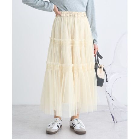 スタイリングのアクセントに欠かせないチュールスカート。二枚合わせでボリュームを付けたシャーリングフリルのティアードラインがフェミニンな印象です。セットではもちろん、単体でも愛用出来るマルチウェイな仕様が嬉しいポイント。デニムに合わせたトレンドのカジュアルスタイルにも活躍してくれる着回し力の高いアイテムです。