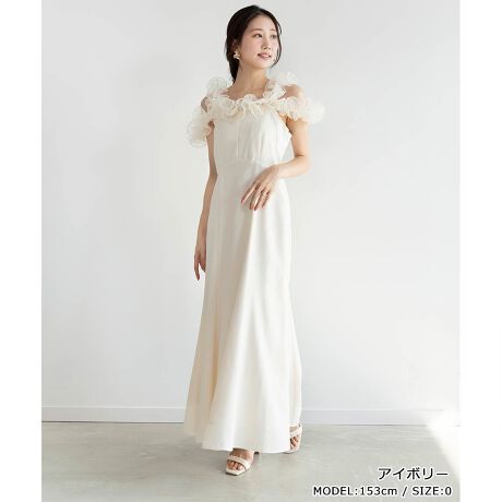 ・肩にデザインされたボリュームたっぷりのフリルが華やかな印象