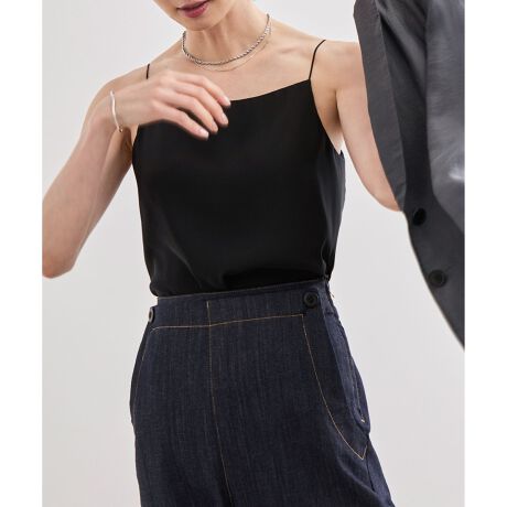ご好評いただいているキャミソールを一枚で着られるカップ付きにアップデート。トレンドやシーズンに問わられず着られるシンプルでエレガントなキャミソールです。前見頃は光沢のあるサテンを二重にしているので透けずらくすっきりとしたネックラインを実現。後ろ見頃はカットソーなので適度に身体にフィットして快適な着心地です。ストラップは長さを調節できます。