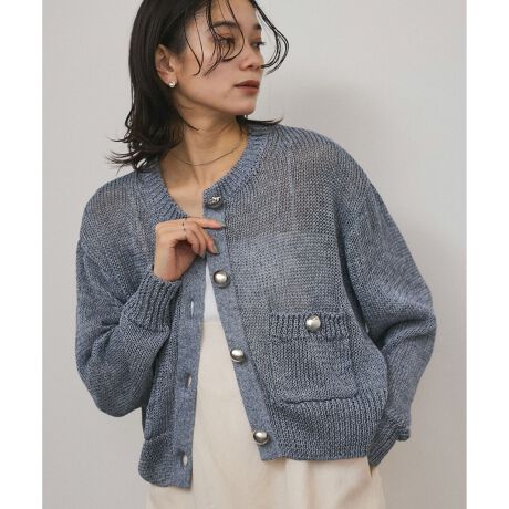 素材感とメタルボタンがスタイリングの主役になるカーディガン。