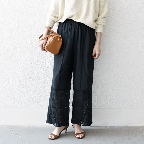 パッチワークのようなブロックレースと刺繍モチーフが存在感のあるイージーパンツ。