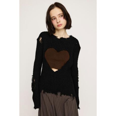 【HEART HOLE 2WAY CRUSH TOPS】■POINT:大胆なハート型のホールが目を引くニットトップス。クラッシュ加工が施されていて甘くなりすぎずバランス感のある一枚に。■DETAIL:前後2WAYで着れるので気分によってスタイリングを変えられます。程よいサイズ感のニットなので,着膨れせずアウターとも合わせていただけます。■STYLING:インナーにレーストップスを合わせたり、カラー物を合わせてホール部分から見せるスタイリングが可愛いです。2WAYなので幅広いコーディネートに合わせやすいです。■FABRIC/MATERIAL:張り感のあるポリエステルシャギーナイロンを使用しています。■透け感:部分的にあり■光沢感:なし■伸縮性:あり■裏地:なし※本品はデザインとしてダメージ加工(生地切れ、ほつれ、穴あき、リペア等)をしています。着脱及び着用時の引っ掛かりにご注意下さい。加工特徴により、一点一点表情が異なります。洗濯や着用の繰り返し等により、ダメージ箇所が広がる場合がありますが、加工特性をご理解頂き、製品の変化をお楽しみ下さい。本品は素材の特性上非常にサイズが不安定です。物により寸法の個体差が大きく生じることがありますが、製品に問題はありません。ハンガー等に吊るしておくと寸法が大きく変わってきてしまうので、取り扱いには十分ご注意してください。※商品画像はサンプルのため、色味やサイズ、素材の混率等の仕様に変更がある場合がございますので、予めご了承ください。※一部予約商品につきましては生産上の都合によりお届け予定日や店頭発売と前後する場合もございます。※追加生産商品は、一部の店舗、通販で販売中の場合がございます。予めご了承下さい。