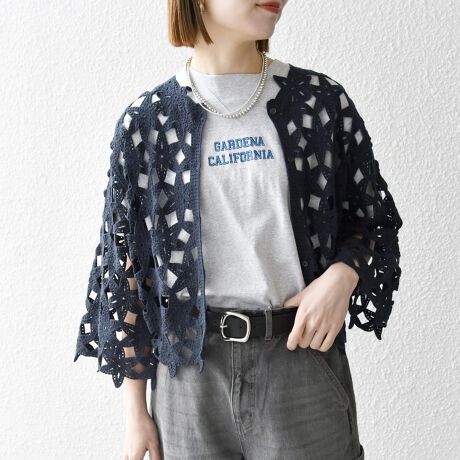 シンプルなクルーネックカーディガンの形に、クロシェレースを施した一着。