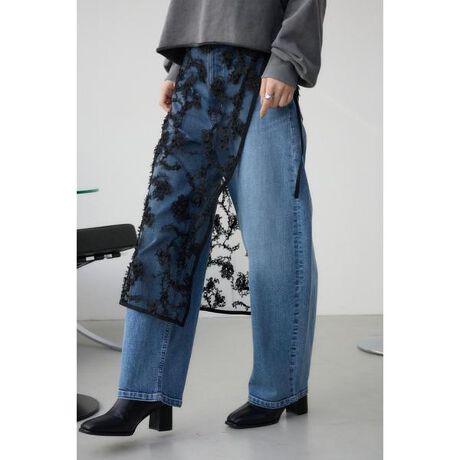 ■シアーレーススカート■ポイントスタイリングのポイントになる、立体的なレースを使用したレーススカート。■ディティール立体感のある華やかな3Dレースのラップデザインスカートです。春らしいレイヤードにぴったりな一枚です。■スタイリングデニムとレイヤードしたカジュアルなスタイルはもちろん、シンプルな同色のスラックスなどにレイヤードしたシックなスタイルもおすすめです。■生地チュール素材に刺繍を施したクラフト感のあるチュールレースを使用しています。透け感:あり裏 地:なし伸縮性:なし光沢感:なし