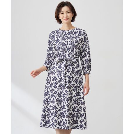 ■デザインフィットアンドフレアシルエットのワンピース。前身頃にタックディティールを施し、1枚でもジャケットの中に着てもサマになるデザインに仕上げました。共布リボンで、自由にスタイリング出来ます。ジャケットでフォーマルにも、カーディガンでカジュアルにもご着用頂けます。身頃のみ裏付きです。大胆なフラワー柄もアクセントになり、上品に着こなしが出来ます。