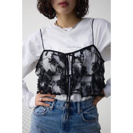 ■シアーレースビスチェ■ポイントスタイリングのポイントになる、立体的なレースを使用したビスチェ。■ディティール立体感のある3Dレースに、程よいボリュームのギャザーがポイント。コンパクトな丈感でインナーを選ばす、シャツやニットなど幅広いトップスとレイヤードが出来ます。■スタイリングコンパクトなニットやスカートを合わせたレディライクなスタイルが〇カジュアルなシャツやデニムを合わたスタイルも抜け感が出ておすすめです。■生地チュール素材に刺繍を施したクラフト感のあるチュールレースを使用しています。透け感:あり裏 地:なし伸縮性:なし光沢感:なし[注意事項]※画像の商品はサンプルです。実際の商品と仕様、加工が若干異なる場合があります。※画像の商品は光の照射や角度、お使いのモニター環境により、実物と色味が異なる場合がございます。※着用、お取り扱いの際は、アテンションタグをご確認ください。