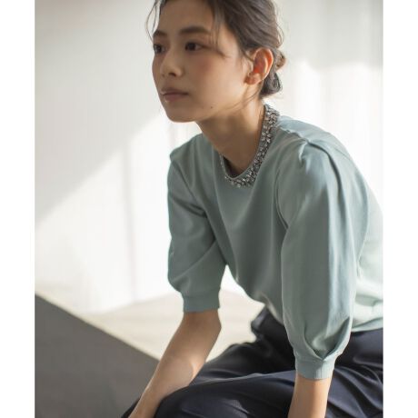 ■デザイン襟元にあしらったビジューパーツはまるでゴージャスなネックレスをしているような贅沢なデザインです。袖はパフスリーブの5分袖。同素材のニットジャケットと合わせてエレガントに、デニムとスタイリングして外しのカジュアルスタイリングもおすすめです。