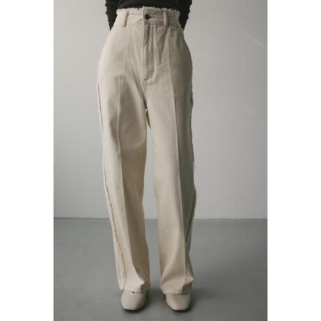 モデル身長166cm(Mサイズ着用)センタープレスで美脚見えが叶う大人ワイドデニムパンツ。ステッチデザインが映える一枚。フリンジディテールを施したカジュアルなアイボリーとワンウォッシュを加えたモードなインディゴの2色展開です。500ISS10-0841(デニムカバーオール)とセットアップ着用可能。透け感なし、ストレッチなし。【お手入れ方法】マシンウォッシュ可