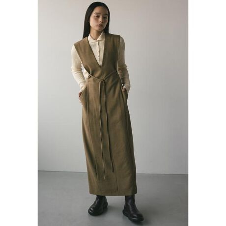 [型番:500IST33-0171]モデル身長163cm(Mサイズ着用)深めVネックとバックリボンがポイントのジャンパーワンピース。ストレッチの効いた生地を使用したスカートはボディラインをひろいにくいコクーンシルエットに仕上げました。バックスリットで足さばきもしやすい一枚です。ポケット付き。ストレッチあり、透け感なし。【お手入れ方法】マシンウォッシュ可