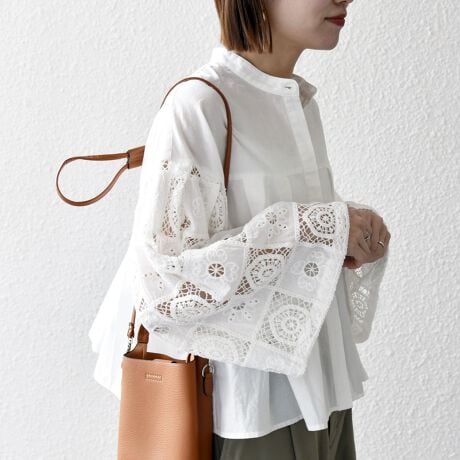 きちんと感のあるバンドカラーと、レースの透け感のバランスが絶妙な一着。