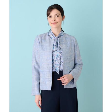 イタリア製のファンシーツイードを使用したジャケット。ナチュラルな麻のスラブ感と清涼感のあるブルーが品の良い春らしい一着です。ポケットには共布フリンジをあしらっています。着丈が短めのノーカラーデザインなので、フレアスカートや、ワイドパンツなどを合わせるのがおすすめ。またデニムパンツを合わせてきれいめスタイルも素敵です。------------------------------------着用シーズン:春伸縮性:なし透け感:なしポケット:あり生地の厚さ:やや薄手裏地:あり-------------------------------------※商品の色味は、撮影場所や光のあたり具合、お客様のお使いの機器により色味が違って見える場合がございます。予めご了承ください。