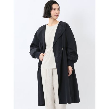 上品な印象を添えてくれるノーカラーのロングコートです。袖口のリブ切り替えとウエストのドローコードがポイント。前開きでサラッと羽織った抜け感のあるスタイルやウエストを絞ったメリハリのあるスタイル等、着こなしのアレンジを楽しめます。