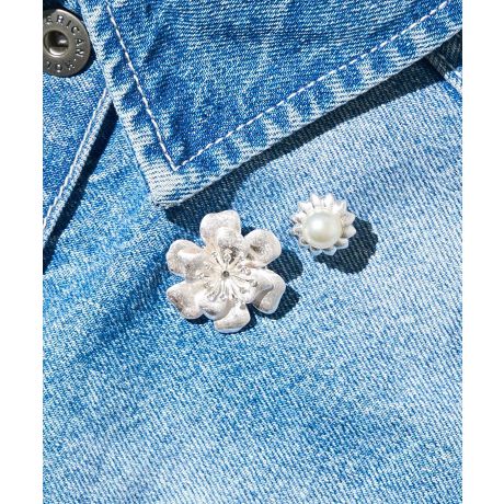 マットメタルをモチーフ使いした上品な印象のデザインブローチ。大きなフラワータイプとパールポイントタイプです。それぞれ単体でも活躍し、2つを並べてスタイリングすればぱっと華やかな雰囲気に。ピンバッチ留めとピンタイプ、どちらも扱いやすく、ハットやストールなど小物にも合わせていただけるおすすめのアイテムです。※モデル着用画像は、光の当たり具合で色味が違って見える場合がございます。※お使いのモニター環境によって商品の色味が違って見える場合がございます。