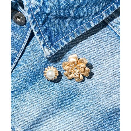 マットメタルをモチーフ使いした上品な印象のデザインブローチ。大きなフラワータイプとパールポイントタイプです。それぞれ単体でも活躍し、2つを並べてスタイリングすればぱっと華やかな雰囲気に。ピンバッチ留めとピンタイプ、どちらも扱いやすく、ハットやストールなど小物にも合わせていただけるおすすめのアイテムです。※モデル着用画像は、光の当たり具合で色味が違って見える場合がございます。※お使いのモニター環境によって商品の色味が違って見える場合がございます。