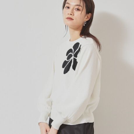 胸元のフラワーモチーフがポイントのパフスリーブニット。