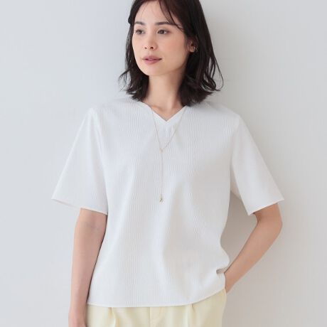 ウェーブ状の凹凸感が特徴のハリ感ある素材を使用したシンプルなTブラウスです。