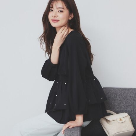 華やぎを添えるパール調付きドッキングペプラムトップス