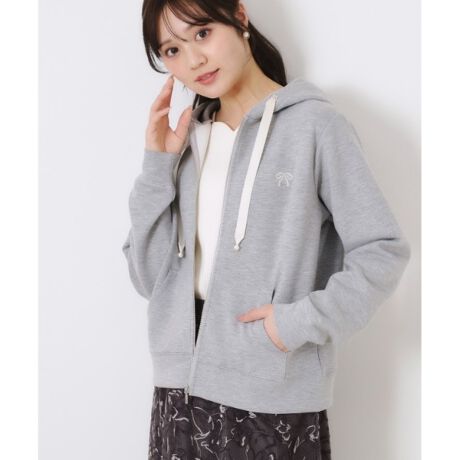 左胸にリボンのさりげない刺繍と、ひも先にパール調パーツのついたクチュールらしいデザインパーカー