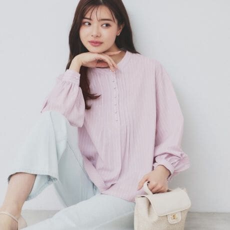 ラメラインが上品なバンドカラーブラウス