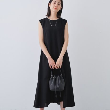デザインディテールはシンプルに、ややボリュームのあるヘムバランスで雰囲気を出したワンピース。