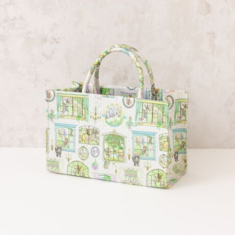 yukiemonデザイナー・松浦由起江氏プロデュースのテキスタイルブランド『22fabric』のムービースタジオ柄を地厚なサテン生地にプリントした生地を使用した横長トートバッグ。