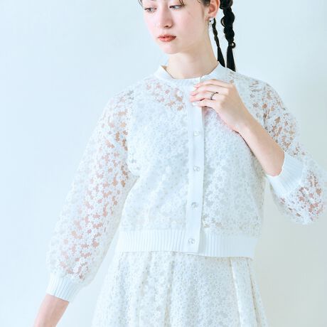 ・シアー感のあるオーガンジー素材に小さくはかなげなフラワー刺しゅうが施されたカーディガン。
