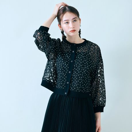 ・シアー感のあるオーガンジー素材に小さくはかなげなフラワー刺しゅうが施されたカーディガン。