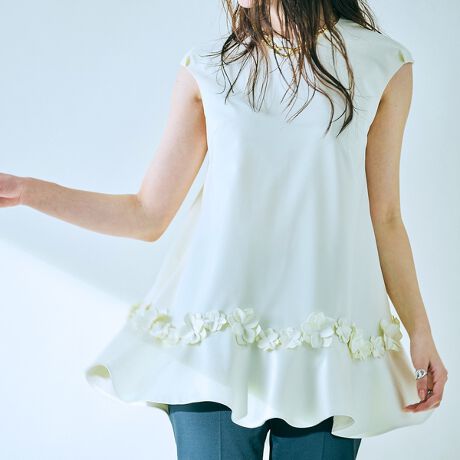 ・裾の切替に施したフラワーモチーフがラグジュアリーな印象のブラウス。