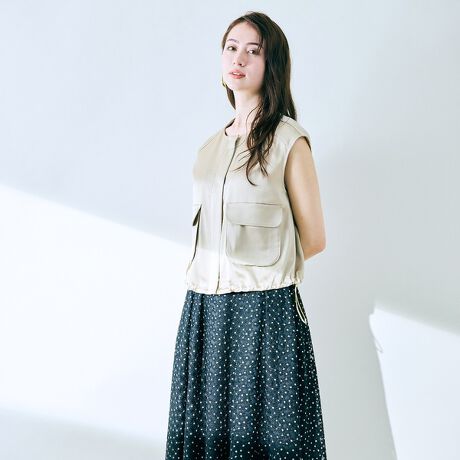 ・オンオフ兼用で楽しめる、ストレッチサテン素材のノーカラーベスト。