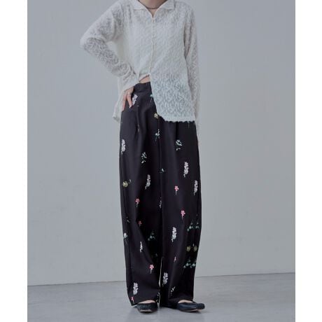 前面に施したタックでウエストはすっきりとしながらも、ワイドシルエットで腰回りのボリューム感をカバーしてくれる花柄パンツの登場です。