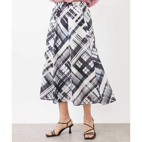 マルチカラーのバイヤスチェック柄をシアーサテンに載せる事で複雑な繊細さと奥行きを持たせたオリジナルプリント素材。程よい透け感と軽さ、素材のハリ感により、シルエットをキープしてくれます。