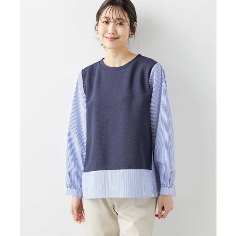 ストライプ生地と無地生地を切り替えて、おしゃれにデザインしたカットソー。