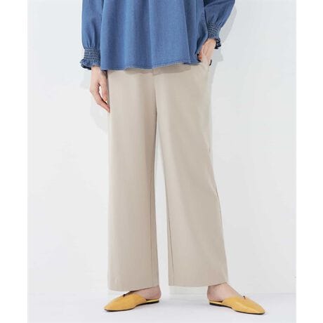 カジュアルになり過ぎないほど良くワイドなシルエットで、気になる下半身をまとめてカバーしスタイルアップをかなえてくれます。ウエストの後ろはゴム切り替えで締め付けずに快適、シンプルで着まわし度も抜群です。