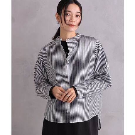トレンドのワイドストライプを採用した、スタンドカラーオーバーシャツ。前裾は軽やかな長さに設定し、後ろ下りのシルエットでメリハリを与えました。腕まわりにゆとりのあるドルマンスリーブは、インナーと重ね着した際もストレスフリーな着心地です。