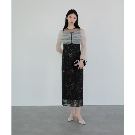 繊細なチュールがデコルテラインを美しく彩り、シアー素材がエレガントな印象を演出します。