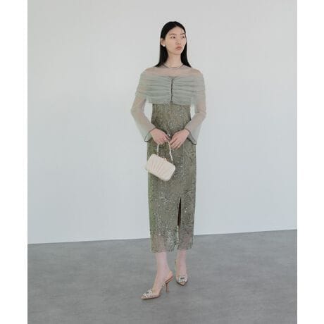 繊細なチュールがデコルテラインを美しく彩り、シアー素材がエレガントな印象を演出します。