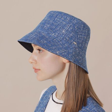 ツイード地と無地のコットン地のリバーシブルバケットハットです。クラウンにはUVカット芯、ツバには遮光率99.99%の遮光芯が貼られており紫外線や暑さ対策に最適です。コーディネートに合わせ両面を着用いただけ、また畳んで持ち運びできるので便利です。熟練した職人によって丁寧に作られたMADE IN JAPANの帽子です。同素材のジレ(品番:G5J01523)もご用意しております。