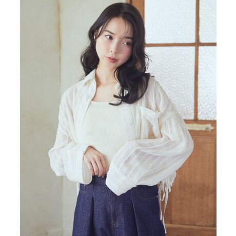 チュールや刺繍をライン使いしたジャカード素材のデザインシャツ。控えめなシアーの抜け感が優しい印象をプラスしてくれる軽やかな一枚です。ショート丈にワイド幅の袖バランスがこなれ感たっぷり。サイドにドロストリボンをプラスして絞りアレンジした甘めのスタイリングも楽しめます。