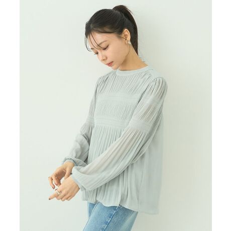 軽やかなシフォン生地で仕立てたデザインブラウス。爽やかなシアー素材と、幅を変えた表情豊なマジョリカプリーツが春の着こなしを後押しします。デコルテが覗く程よいクルーネックにふんわり広がるフレアシルエットでコンフォートな着心地もポイント。裏地付きで安心して着用出来、カジュアルにもきれいめにも幅広いスタイルでお楽しみいただけます。