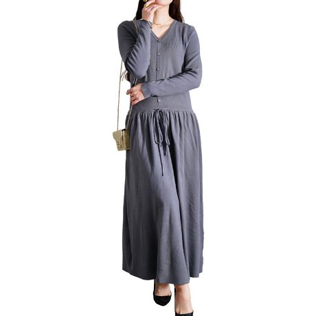 【ワンピース】 ニット Vネック ドロスト 長袖 ロング 無地 ブラウジング グレー ブラウン 青