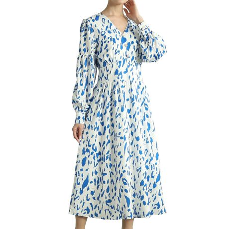 【ワンピース】 ドレス 青 ブルー 長袖 アニマル レオパード ミモレ丈 パール フレア 切り替え