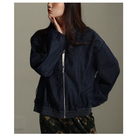 【ジャケット】 アウター ブルゾン ジャンパー 黒 ブラック 青 ブルー 長袖 チュール ドッキング