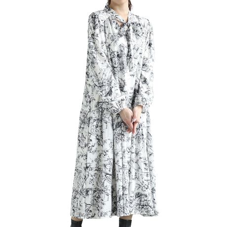線画で描いた風景画が美しいボウタイリボンティアードワンピース。まるで絵画のように美しい模様が目を惹くロマンティックなデザイン。ふわっと広がるティアードの切り替えが華やかなシルエットを生み出します。ボウタイリボン付きの襟がきちんと感を演出してくれます。プライベートのお出掛けはもちろん、オケージョンスタイルにもピッタリです。