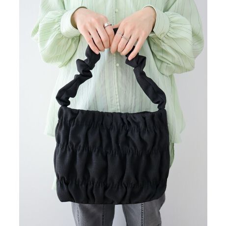 ほんのりラメを加えた素材にシャーリングを施したフェミニンなワンハンドルバッグ。必需品を収納出来る程よいコンパクトなサイズ感がデイリー使いに最適です。物を入れた時にフォルムチェンジするデザインもこだわりのポイント。カラータイプの異なる3色展開で、コーディネートのアクセントにぴったりなアイテムです。※モデル着用画像は、光の当たり具合で色味が違って見える場合がございます。※お使いのモニター環境によって商品の色味が違って見える場合がございます。