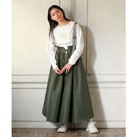 フロントスリットにジップディテールが魅力的なミリタリースカート。女性らしいフレアシルエットに存在感のあるサスペンダーを加えカジュアルライクに仕上げました。ウエストバックゴム仕様でリラクシーな着用感も魅力的。シンプルなカットソーに合わせるだけでインパクトのある着こなしが叶うおすすめアイテムです。透け感[なし]