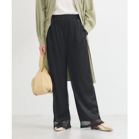 コーディネートがぱっと華やぐラメ入りイージーパンツ。ストレッチの効いたリラクシーな穿き心地ながらも、きれい見えするシアー素材で仕上げました。着脱が楽ちんなウエストゴムに、ポケット付きなのも嬉しいポイント。ラメ&シアーの素材が引き立つ、シャツやロングTシャツなどシンプルなトップスと合わせたスタイリングがおすすめです。透け感[なし]