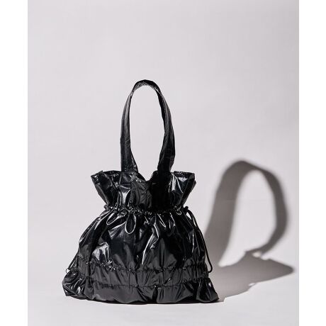 フラットなスクエアフォルムにシャーリングアクセントを効かせたトートバッグ。カバン上部のドロストコードを絞ってシェイプアレンジもお楽しみいただけます。長めのハンドルで肩掛けしやすく、軽量素材なのも嬉しいポイント。メタリックに艶めくシルバーにクールなツヤ感のブラック、どちらも魅力的な2色展開です。※モデル着用画像は、光の当たり具合で色味が違って見える場合がございます。※お使いのモニター環境によって商品の色味が違って見える場合がございます。